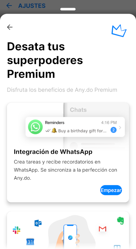 Antes de nada, el disclaimer: esta integración con WhatsApp requiere la versión Premium de Any.do. También es verdad que ofrecen periodos de prueba bastante asequibles. Yo solo estaba jugando, pero, a aquellos que se dediquen a trocear proyectos y repartirlos en equipos, les sugeriría echarle un ojo:
