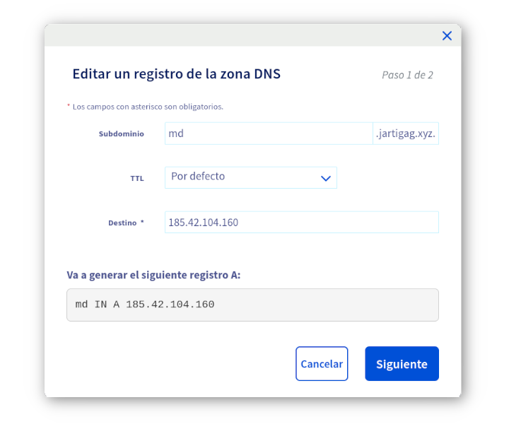 También deberíamos asegurarnos de que en nuestros registros DNS (que normalmente gestionamos desde la web del proveedor al que le compramos nuestro dominio) hay una entrada “A” que une nombre con dirección IP: