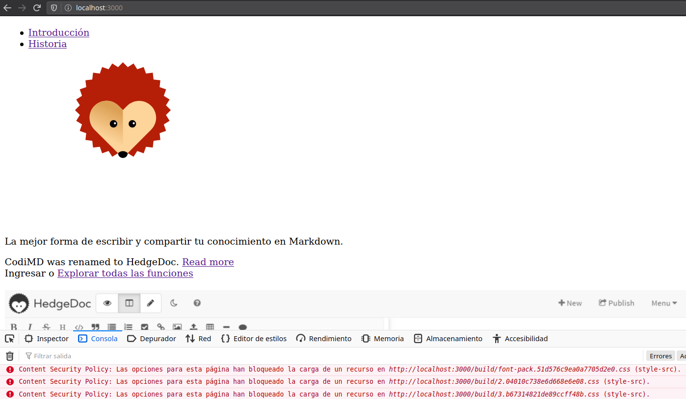 Pero, si vamos a http://localhost:3000 en un navegador y abrimos la consola de “Herramientas para desarrolladores”, vemos la consecuencia del warning que nos está dando HedgeDoc en sus logs:
