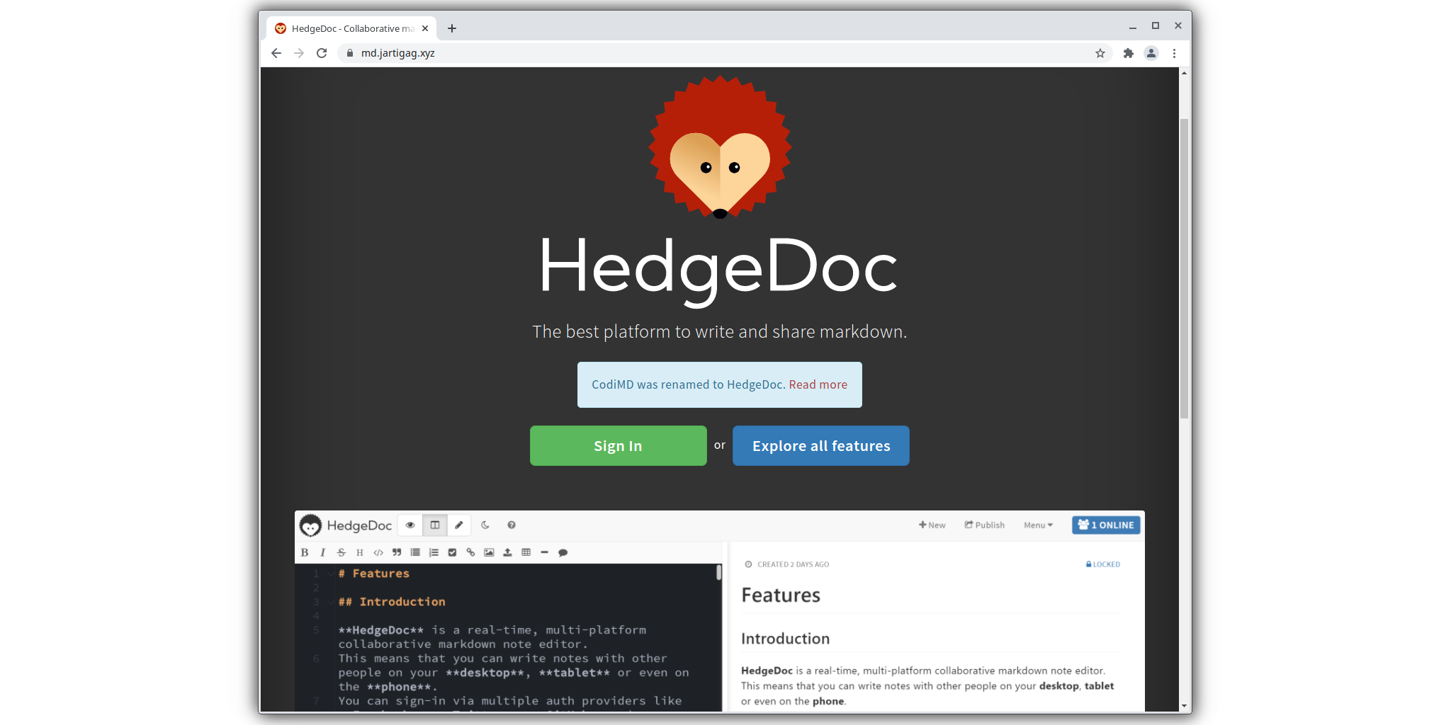 TL;DR: Ahora HackMD es la marca enterprise, y HedgeDoc, la versión desarrollada por la comunidad. CodiMD se ha quedado como la versión que libera el equipo de HackMD, con funcionalidades limitadas.