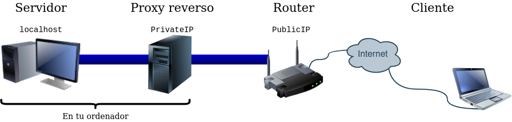 ¿Qué es un proxy? Creo que la traducción sería “apoderado”, aunque es un término que no se suele traducir. Pero el concepto sería ese: alguien que actúa en tu nombre. Un proxy hace peticiones en tu nombre y luego te las hace llegar. Un proxy reverso se basa en la misma idea: el proxy hará de intermediario. La diferencia es que con un proxy normal tú haces de cliente (eres el que pide), mientras que, si tienes delante un proxy reverso, será porque tú tienes el rol de servidor. Es decir, es a ti a quien le quieren hacer peticiones los clientes. Al poner un proxy reverso, los clientes solo hablan con el proxy, y él es quien hace llegar las peticiones al servidor correspondiente.