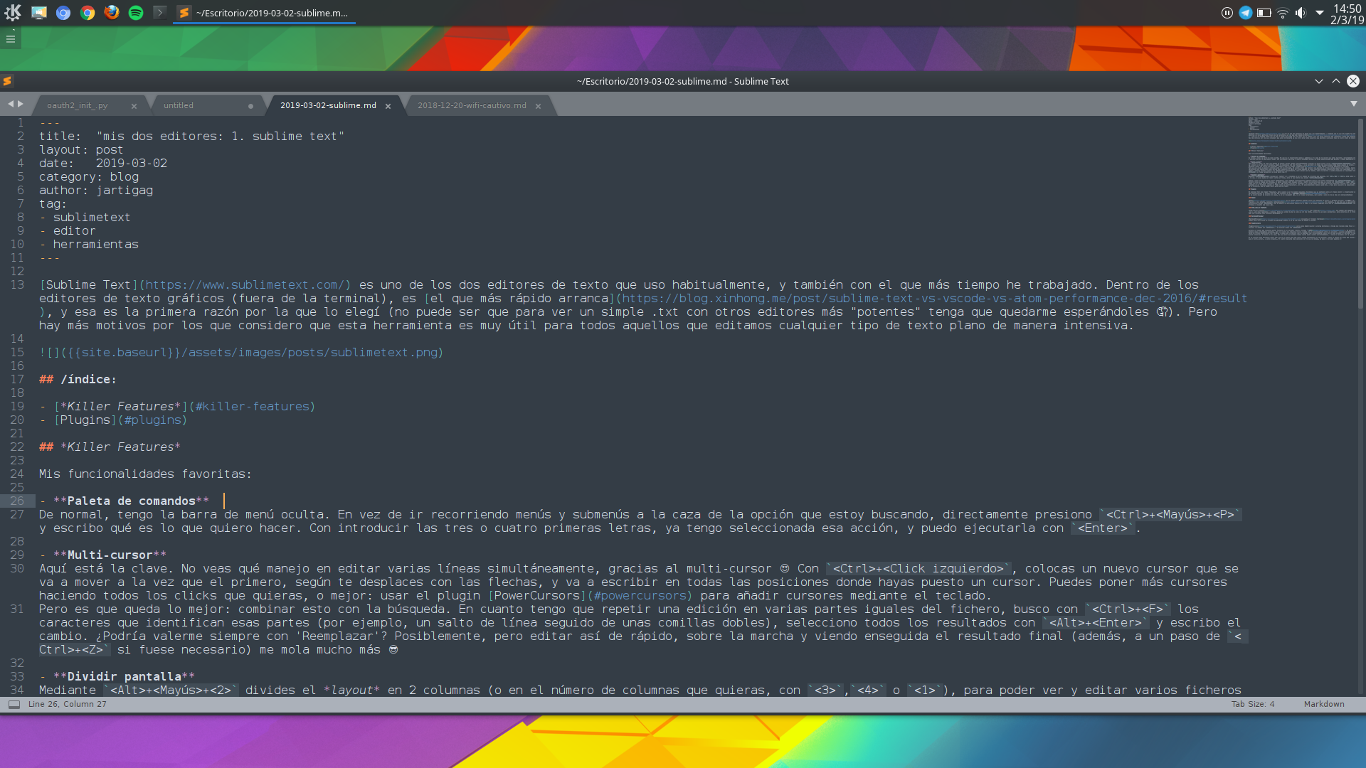 Sublime Text es uno de los dos editores de texto que uso habitualmente, y también con el que más tiempo he trabajado. Dentro de los editores de texto gráficos (fuera de la terminal), es el que más rápido arranca, y esa es la primera razón por la que lo elegí (no puede ser que para ver un simple .txt con otros editores más “potentes” tenga que quedarme esperándoles 🤦). Pero hay más motivos por los que considero que esta herramienta es muy útil para todos aquellos que editamos cualquier tipo de texto plano de manera intensiva.